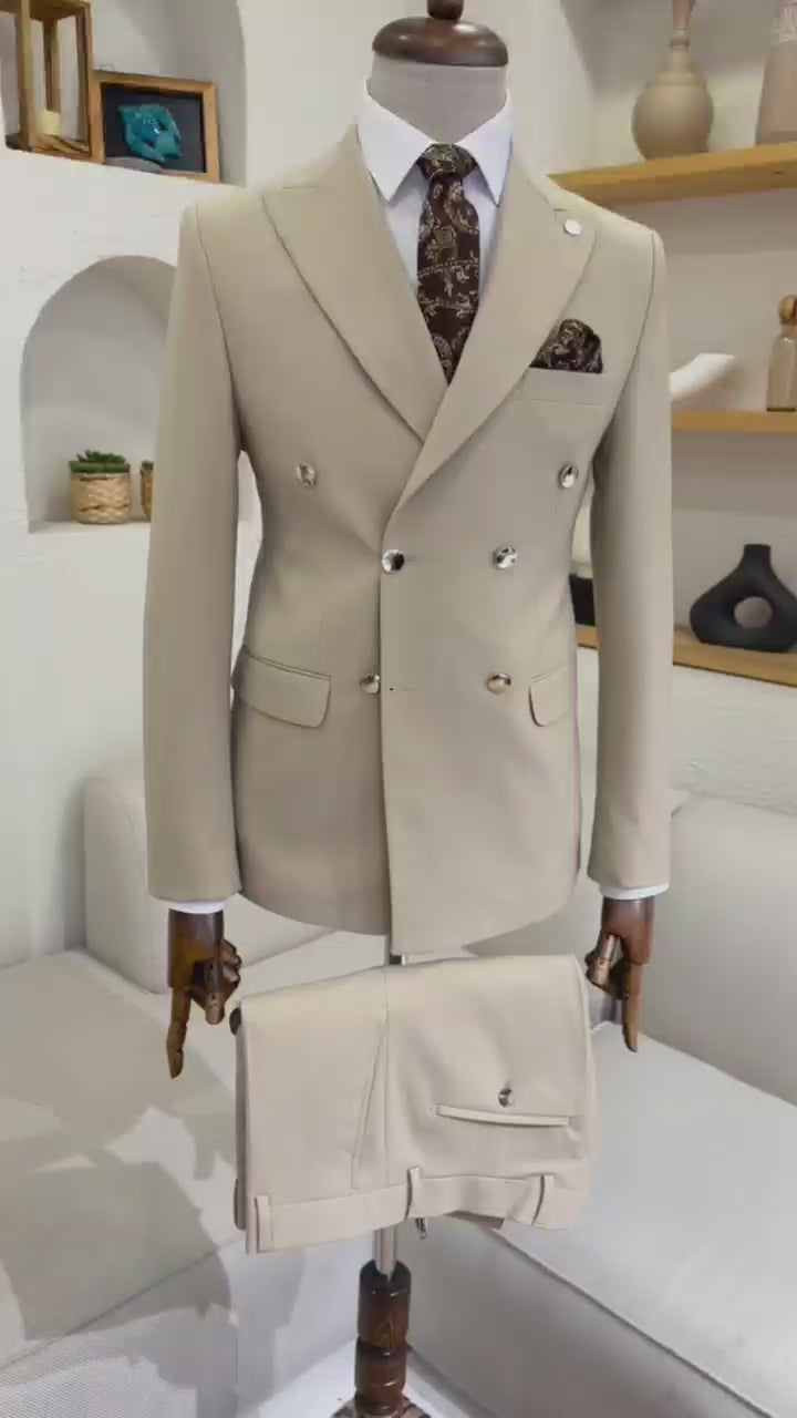 The Beige Baron Double-Breasted Suit is a testament to timeless elegance, featuring a soft beige color in a modern slim fit. It offers a fresh take on classic suiting, perfect for daytime events and summer weddings.