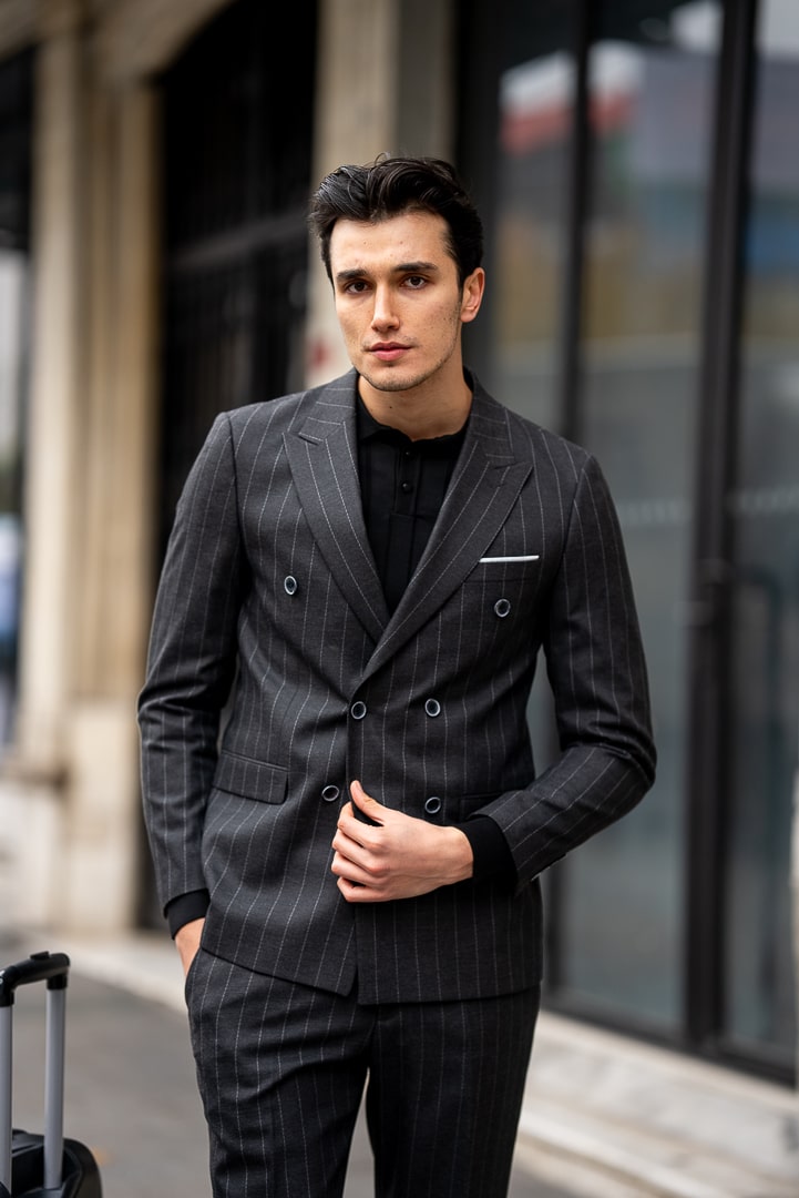 Make a powerful statement with this men’s charcoal pinstripe double-breasted suit.